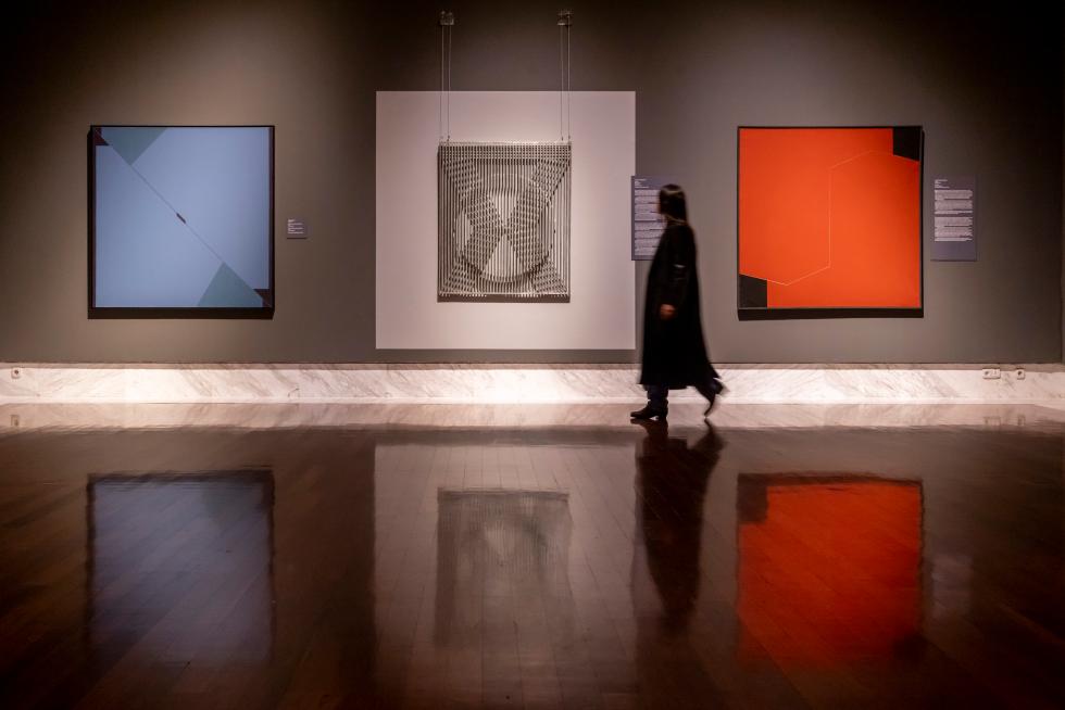 Paral·lelament, l’abstracció va ser progressivament assumida i promoguda com a emblema de modernitat, donant lloc a llenguatges informalistes, geomètrics i òptics representats per autors com Eusebio Sempere o José María Yturralde. Esta convivència d’enfocaments mostra com els artistes van explorar solucions formals per a respondre a un context canviant sense renunciar a una investigació plàstica rigorosa. La precisió tècnica i el joc perceptiu d’estes propostes acosten al públic a una indagació sobre ritme, llum i espai.