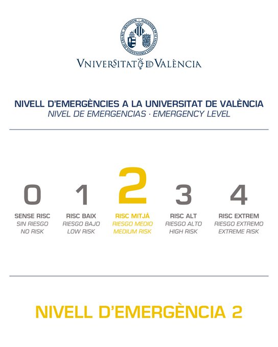 La Universitat de València ha declarat el nivell d’emergència 2 des de les 00.01 fins a les 15.00 d’este dilluns i ha suspés l’activitat docent presencial en tots els seus campus i instal·lacions. La docència s’ha traslladat a format en línia sempre que siga possible per a minimitzar desplaçaments en les hores de pitjor temps.