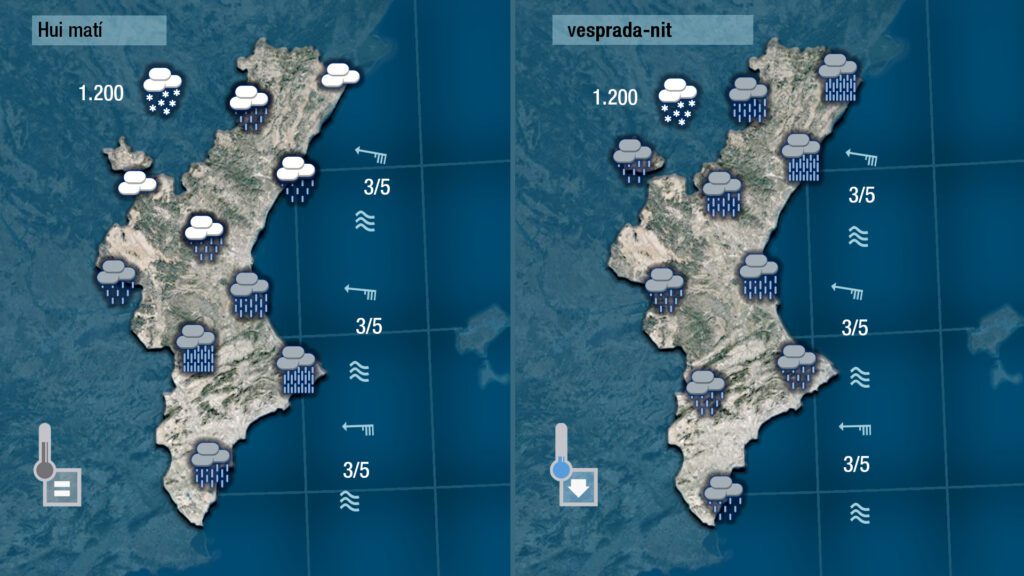 Pluges més dèbils de matí a Castelló però amb una cota de neu que podria quedar al volant dels 1.200 metres, i pluges generals i més intenses a partir de migdia a la mitat nord del territori, amb temperatures més baixes al nord i sense canvis apreciables al sud.