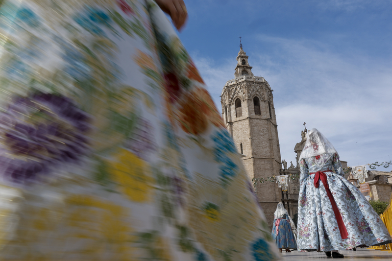 Superats ja els dies centrals de la Setmana Gran, la festa avança cap al seu desenllaç amb el segon dia de l’Ofrena a la Verge dels Desemparats. A mesura que desfilen les comissions falleres, es va revelant el disseny del mantell de la patrona, guardat amb zel durant mesos. Ja s’aprecia un colom format per clavells blancs que descansa sobre un mantell de flors roges, sota el qual es dibuixa la silueta d’una dona i una xiqueta agafades de la mà, confeccionades amb clavells grocs. El resultat és una imatge simbòlica i molt recognoscible per a veïns i visitants, que veuen com la plaça de la Verge es transforma en un gran tapís floral.